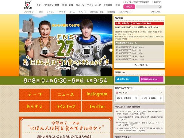 FNS27時間テレビ にほん人は何を食べてきたのか? 放送日 9月8日 (土)午後6時30分~~9月9日 (日)午後9時54分 テーマ にほん人は何を食べてきたのか? 総合司会 ビートたけし キャプテン 村上信五(関ジャニ∞)FNS27時間テレビ にほん人は何を食べてきたのか? オフィシャルサイト。 18年9月8日(土)~9月9日(日)。 今年のテーマは「にほん人は何を食べてきたのか? 」バラエティー、ドラマ、情報、スポーツ、アニメと縦横無尽にジャンルをわたって"にほん人は何を食べてきたのか? "を掘り下げる真にスペシャルな二日間をお届け! FNS27時間テレビ にほん人は何を 「fns27時間テレビ にほん人は何を食べてきたのか? 」のトピックスを作成して、みんなで情報交換しよう! この番組のトピックスを作成 ※無料のユーザ登録が必要です
